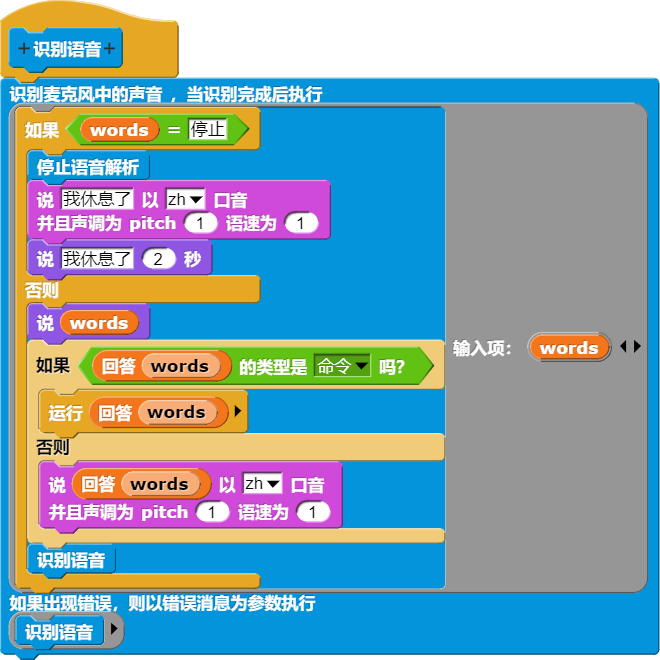首先我们来定义一个识别语音的积木,当识别完成后判断识别出的词汇,如果是“停止”,则停止语音解析,否则处理这个词汇对应的动作,然后继续执行“识别语音”这个积木。